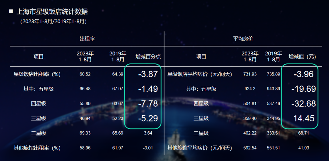STR发布的2023年十一长假期间上海的相关数据显示,尽管上海的整体水平超过了2019年,但以浦江两岸为代表的城市核心商务区域,入住率仍未超过2019年同期水平。