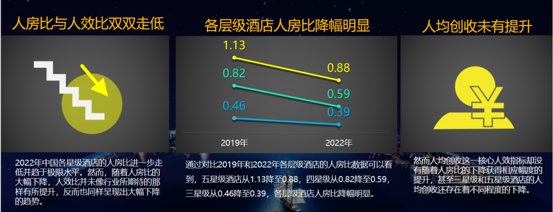 探究上述背离的底层逻辑,可以大致集中在三个层面:从宏观层面看,源于行业面对的诸多不确定性,如宏观经济下行压力,地缘政治博弈日趋激烈,这些因素传导到酒店业,使得行业复苏的节奏和轨迹与以往明显不同;从中观层面看,受房地产因素的影响,酒店行业从股权结构到商业模式都面临着一次大拆解,传统商务需求明显萎缩;从微观层面看,尽管2023年RevPAR数据较2019年还算过得去,但出租率指标总体上较为低迷。大家在2023年初寄予厚望的流量“井喷”只出现于个别地区的个别时间段,总体上看并没有全面显现。
