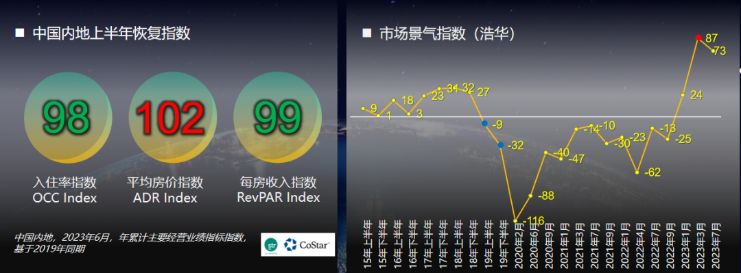 2023年前期,行业恢复的整体水平也仅仅是勉强接近于2019年,但行业的信心指数却在2023年一季度出现了自有此统计发布以来的极值,达到创纪录的87。笔者清楚地记得这一指标发布时,酒店群体的极度亢奋,以至于一些资深人士都预估接下来必将突破90,奔向100更是指日可待。